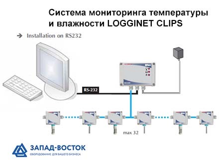 Датчики измерения, центральный записывающий блок измерений и сетевые провода соединяются в сеть портами RS-485 и RS-232 в систему LOGGINET с выводом на ПК пользователя. Система отличается низкими затратами на соединение элементов, легкую сборку и быстрый монтаж. Система LOGGINET CLIPS позволяет контролировать и записывать до 237 точек температуры и влажности измерения.